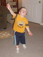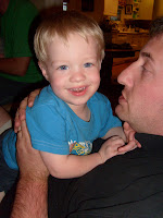 One of my very favorite places to be is on Mom and dad’s back porch. There always seems to be the most perfect breeze no matter how hot it is ouside. She has a great porch swing that the kids love. We put Ben’s exersaucer on the back porch and he loves the breeze blowing through his new “fluffy” hair as John calls it.