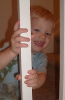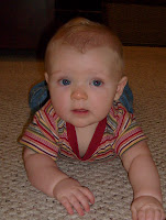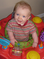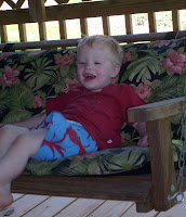 One of my very favorite places to be is on Mom and dad’s back porch. There always seems to be the most perfect breeze no matter how hot it is ouside. She has a great porch swing that the kids love. We put Ben’s exersaucer on the back porch and he loves the breeze blowing through his new “fluffy” hair as John calls it.