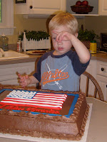 God Bless America is what the cake said that mom bought from Cosco to feed the five thousand. We only ate 1/20 of the cake. It has been packed up and put in the freezer for a 4th of July Party. John’s version of “God Bless America” doesn’t sound like it should. Come to think of it, it sounds an awful lot like “Happy Birthday.” Anyone who would like to come for cake on 7/4/08 you are all invited! In these first pictures John’s “Nellie” is trying to teach him to salute. He was more interested in putting his fingers into the cake than by his head.