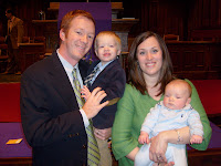 This Sunday Ben turned 4 months old and was baptized. Since many family members were in for Pop’s birthday we thought it would be a good time for the baptism. We were nervous for how John would act in the front of the church, but he did suprisingly well- other than calling out dad’s name a couple times and for spotting cousins in the congregation. It is always special to have Dad perform a baptism, it was especially precious that Dad asked Pop to come up and to pray for us and Ben. That was a suprise to us and one that brought many tears. Pop has also written a beautiful prayer for Ben which is framed in his nursey. Also, Dad chose to have “Great is the Faithfulness” sung after the baptism which is our Sloop family song and was sung at Anna’s memorial service and John’s baptism. This also brought many tears. In our recommitment to Christ and in Dad’s challenge to Chris and I he told us that “Kyle” Chris and ben’s middle name means “near the chapel.” He encouraged us to always keep Ben near the chapel, near to Jesus. Chris and I feel so blessed by the 2 boys God has given us to love and to nurture and to raise knowing and loving him. Oh how we love our boys! Happy Baptism Benny!
