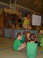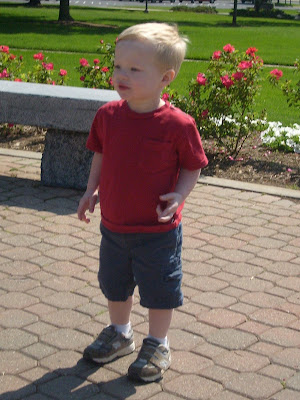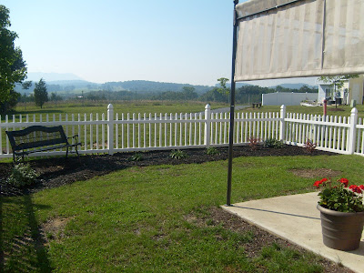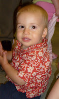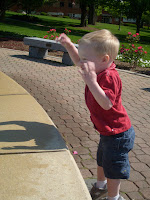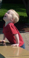 One of my very favorite places to be is on Mom and dad’s back porch. There always seems to be the most perfect breeze no matter how hot it is ouside. She has a great porch swing that the kids love. We put Ben’s exersaucer on the back porch and he loves the breeze blowing through his new “fluffy” hair as John calls it.